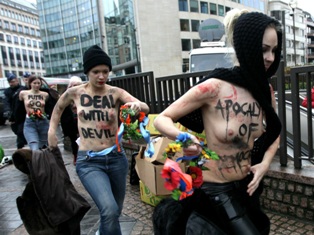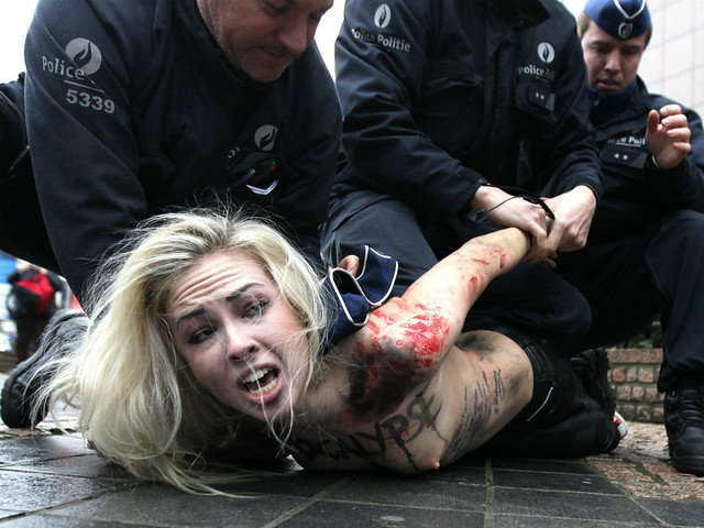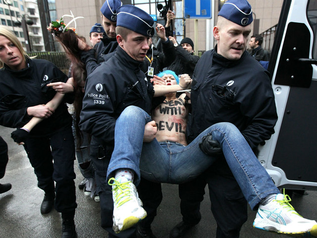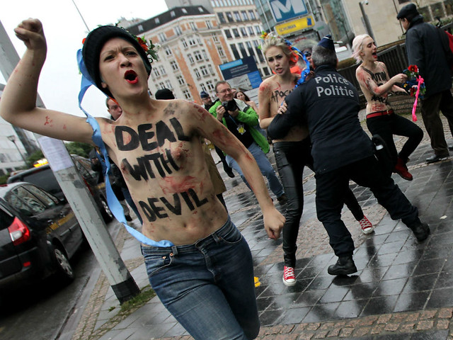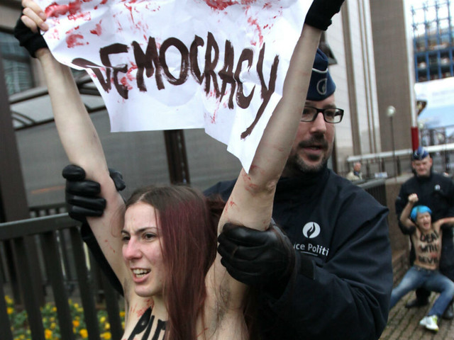Il 21 dicembre 2012 le Femen hanno tenuto una performance a Bruxelles con lo slogan “APOCALYPSE OF DEMOCRACY” (un riferimento inquietante alla fine del mondo, che secondo la profezia dei Maya sarebbe avvenuta quel giorno). Proprio quel giorno a Bruxelles Putin incontrava, in una riunione movimentata, i leader della Unione Europea per parlare di questioni energetiche (la clausola GazProm), di liberalizzazione dei visti e di diritti umani violati (in riferimento all’assassinio di Sergei Magnitsky, un’attivista anti-corruzione ucciso nelle carceri russe nel 2009).