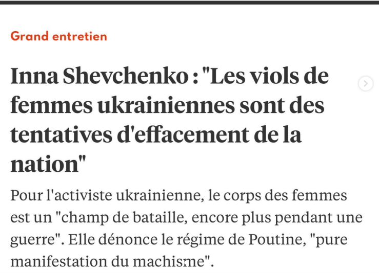 In questi giorni cupi di guerra in Ucraina Inna Ševčenko sul suo profilo Instagram sta continuando il suo impegno denunciando la violenza e soprattutto gli stupri contro le donne ucraine perpetrati dai soldati russi: